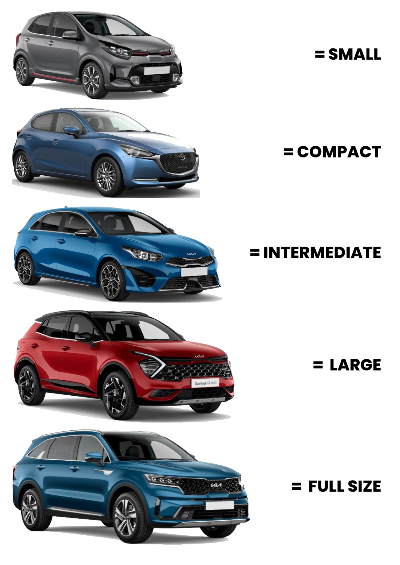 유럽의 렌트카 회사들의 모임인 ACRISS는 렌트카 산업의 표준화 방안 중 하나로 통일된 차량 분류코드(Standard Interline Passenger Procedure, SIPP)를 적용하고 있다. SIPP코드는 네자리로 구성되는데, 첫 번째 자리는 차량의 크기, 두 번째 자리는 문의 수, 세 번째 자리는 변속기와 구동방식(2륜, 4륜, 상시사륜 등), 네 번째 자리는 연료 종류와 에어콘 유무이다. 코드를 사용하는 범위는 회사마다 차이가 있다. 예를 들어 허츠의 경우 첫 번째 코드를 중심으로 사용하고 필요시 두 번째 코드를 부가하는 반면, 알라모의 경우 첫 번째와 함께 두 번째 코드도 다양하게 적용하는 편이다. 렌트카 차량 유형 코드들 중 대표적인 것을 살펴보면 다음과 같다.