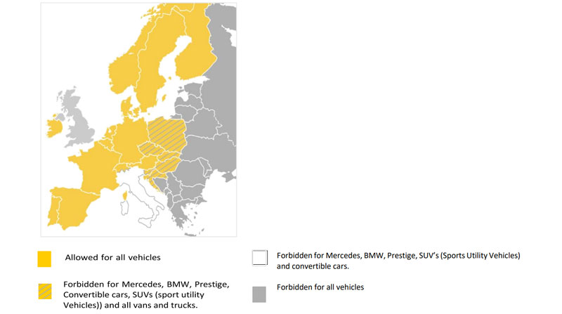 일반적으로 서유럽에서 픽업한 렌트카로 동유럽으로 진입하면 안된다. 따라서 동유럽을 여행할 계획이라면 독일에서 렌트해야 한다. 독일에서 렌트한 경우에도 동유럽의 모든 국가로 진입할 수 있는 것은 아니므로 렌트카 예약 시 진입 가능한 국가에 대해 확인해야 한다. 고급차의 경우 동유럽 및 이탈리아 진입에 제한이 있을 수 있다.