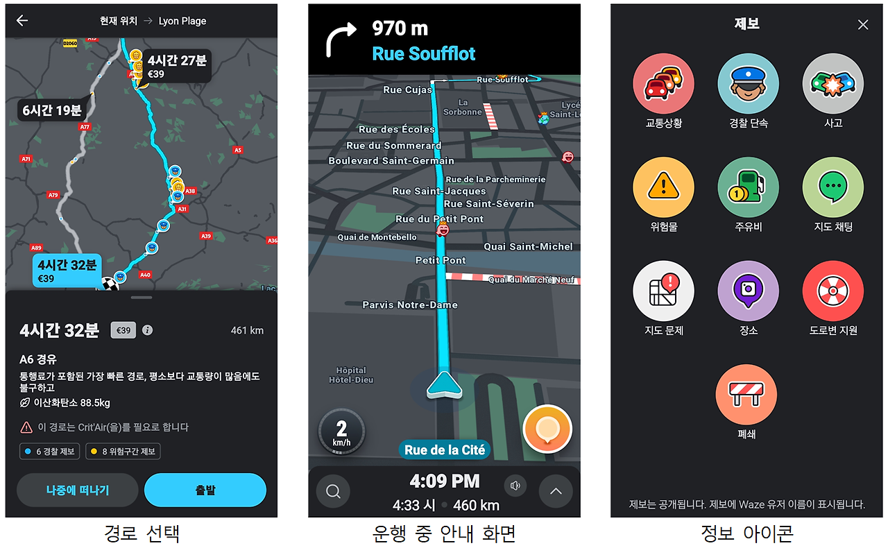 웨이즈 네비게이션의 주요 화면
