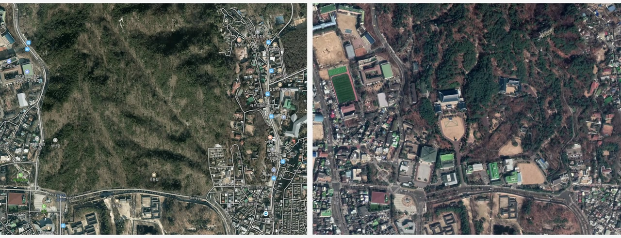 위성지도에서 네이버지도(좌측)는 청와대가 삭제되어 있는 반면 구글지도(우측)에는 나타난다