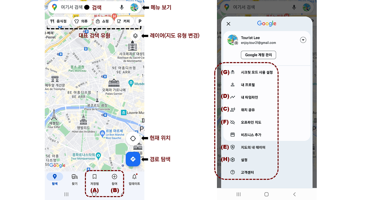 구글지도 모바일 버전의 기본 화면 및 메뉴