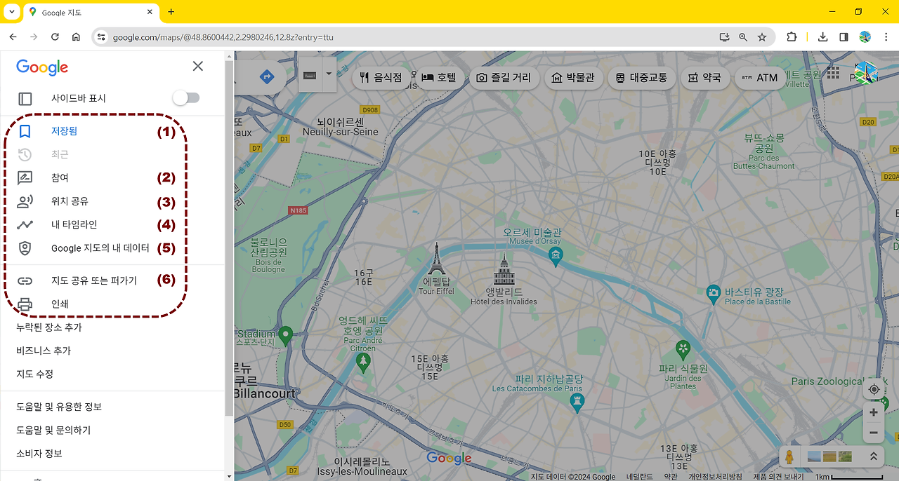 구글지도 데스크톱 버전의 메뉴