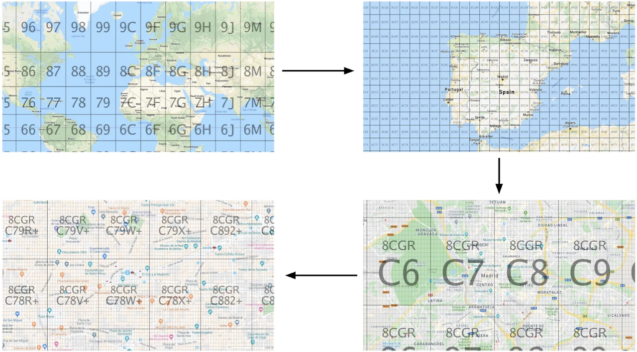특정 장소의 위치와 관련하여 구글 지도에서 제공하는 정보는 일반 주소, 경도/위도, 그리고 플러스 코드이다. 이들 중에서 플러스 코드는 다양한 공간위치코드(Open Location Code : OLC)들 중의 하나로 구글에서 개발한 것이다. 공간위치코드는 격자코드라고도 하는데 세계를 가로, 세로의 격자로 나누고 각 격자별로 코드를 부여한 것이다. 우리나라 산에서 자주 보게 되는 ‘국가지점번호’도 격자코드의 한 종류이다.