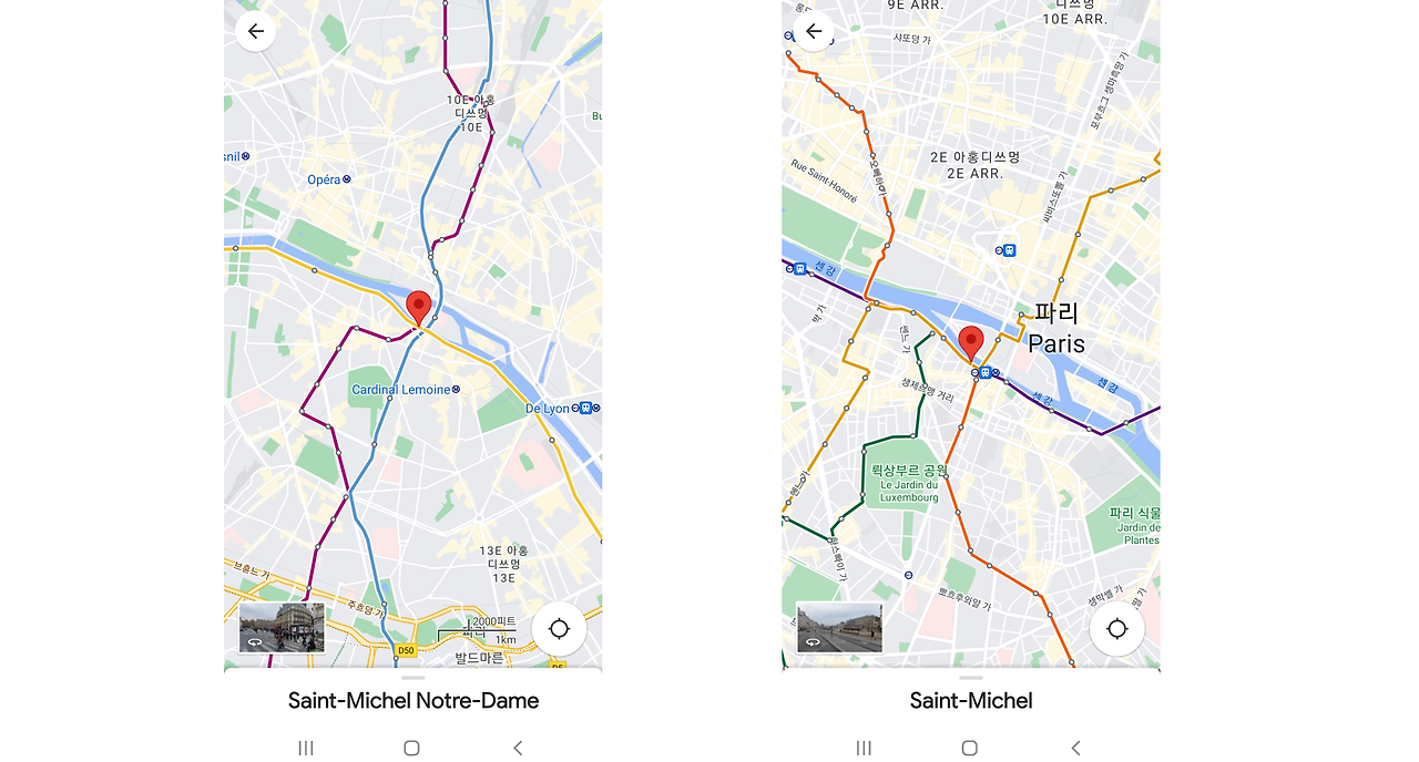 구글지도 모바일 버전에서 철도 역(좌)과 버스 승차장(우)을 선택한 결과