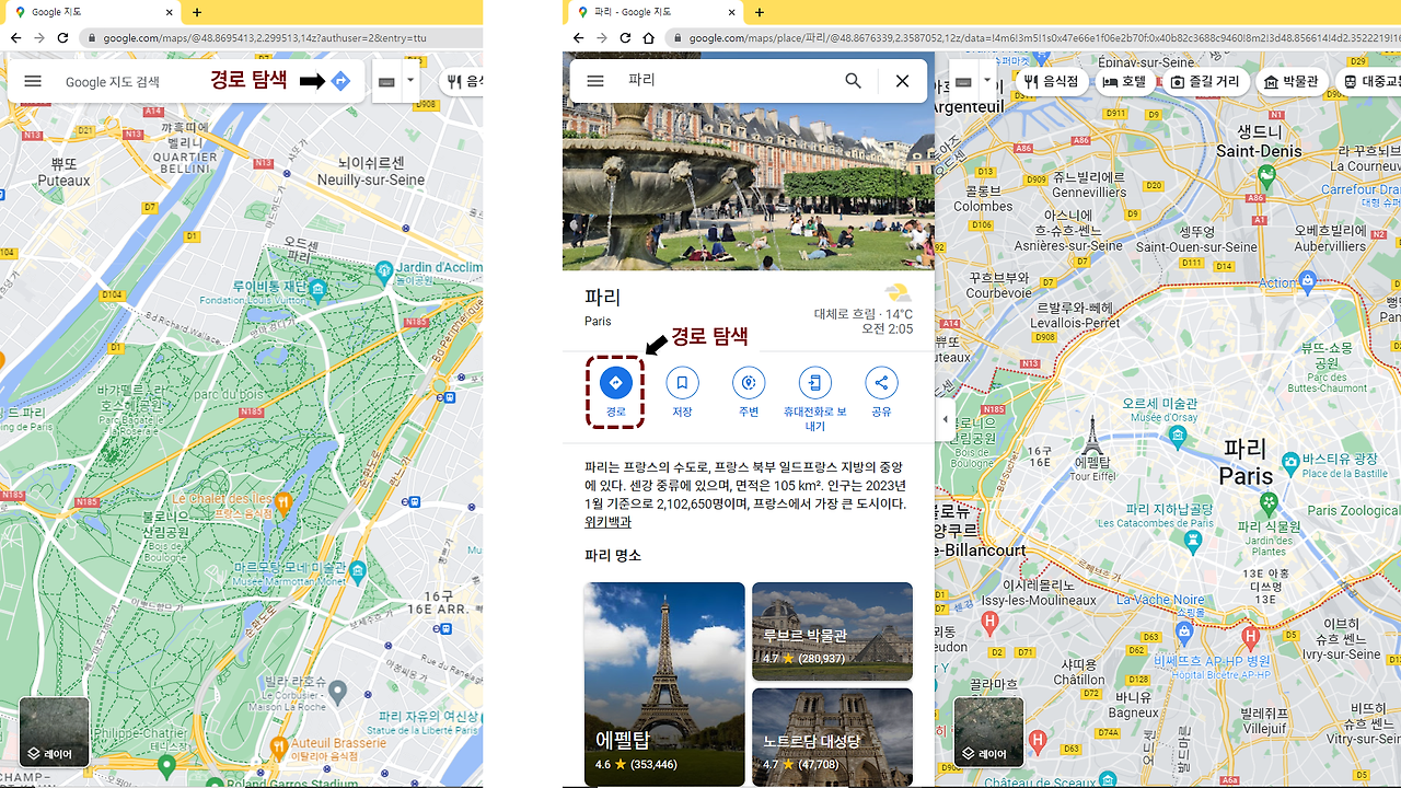 구글지도 데스크톱 버전에서 버전에서 경로 탐색 아이콘의 위치