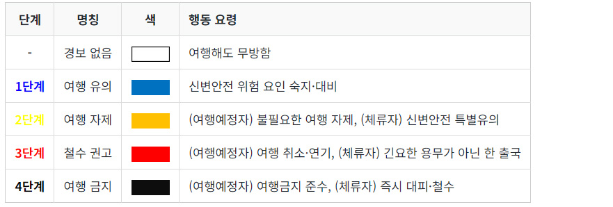여행경보제도는 등급으로 위험도를 표시하고 있는데 등급 구분 및 각 등급별 의미는 다음과 같다.