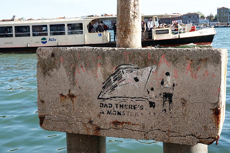 크루저선 입항을 반대하는 그라피티(베니스) - "Dad There's a Monster"