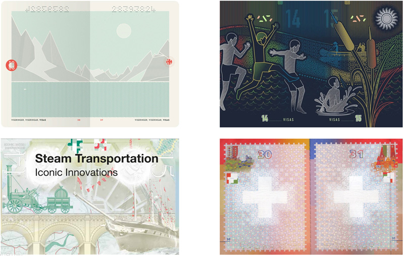 여러 국가의 여권 속지(상단 좌측부터 노르웨이, 캐나다, 영국, 스위스)
