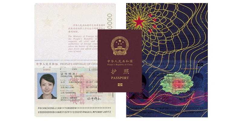 중국 여권 내지 : uv 광선에서 보이지 않는 표시들이 나타남