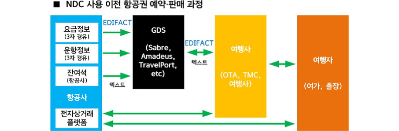 항공 분야의 GDS는 최근 큰 변화에 직면하고 있다. 변화의 핵심은 항공권 판매에서 항공사, GDS, 여행사 간 상호 통신에 사용되는 프로토콜에 관한 것이다. 항공 분야에서 항공권 판매를 위해 기존에 활용되는 프로토콜은 EDIFACT(Electronic Data Interchange for Administration, Commerce and Transport)인데 이 과정에서 제공되는 정보는 스케쥴, 가격, 잔여석에 관한 것이고 이마저도 텍스트 기반으로 제공되어 왔다.