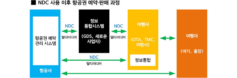 이러한 요구에 대응하고자 국제항공운송협회(International Air Transport Association : IATA)는 2015년 항공권 예약·판매를 위한 차세대 표준 프로토콜인 NDC(New Distribution Capability)를 발표하였다. NDC는 XML에 기반하고 있으며 항공사가 항공권의 기본 정보와 함께 풍부한 정보를 다양한 형태(텍스트, 음성, 사진, 영상 등의 멀티미디어)로 제공하고 예약도 받을 수 있도록 지원하고 있다.