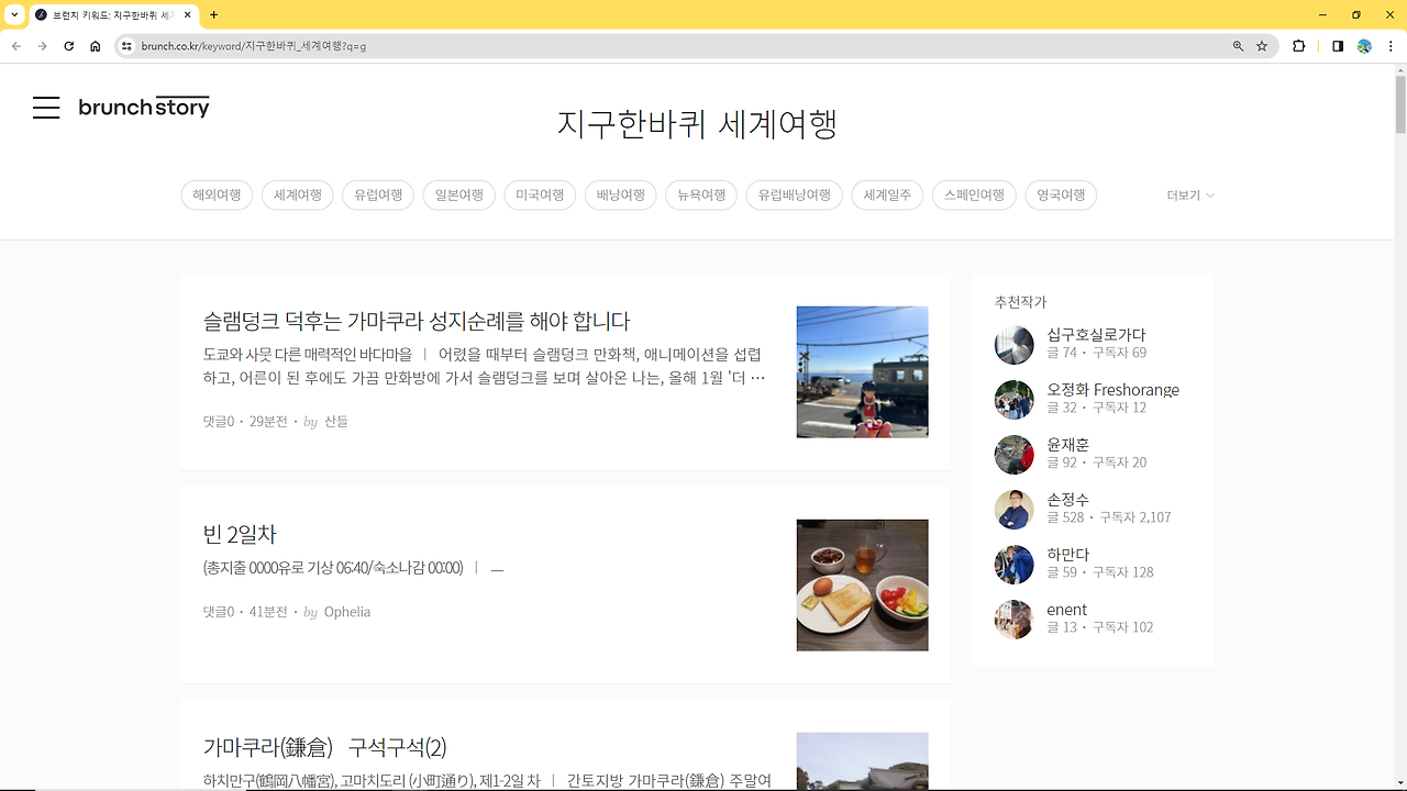 브런치도 여행정보를 얻을 수 있는 좋은 사이트이다. 브런치는 카카오에서 제공하는 글쓰기 공간으로 블로그와 유사한 형태이다. ‘글이 작품이 되는 공간, 브런치’라는 타이틀에서 보듯이 일상생활에서 다양한 소재들을 글감으로 다양한 주제의 글들이 게제된다. 여행도 그 주제들 중 하나인데, 브런치의 글들은 여행에 대한 정보를 소개하기보다는 여행기에 가까운 글들이다. 개성과 감성이 묻어나는 감상문을 통해 여행의 방향과 테마를 결정할 때 많은 도움을 받을 수 있을 것이다.