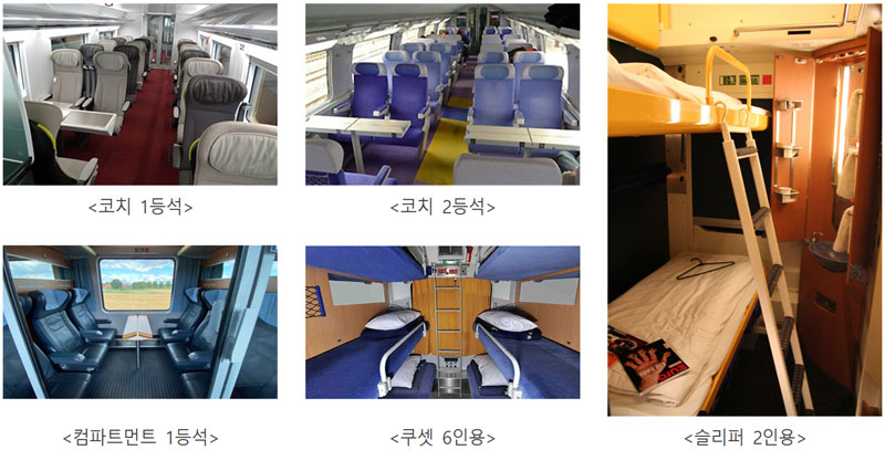 열차의 좌석 종류는 코치(Coach), 컴파트먼트(Compartment), 쿠셋(Couchettes), 슬리퍼(Sleepers)로 구분된다.