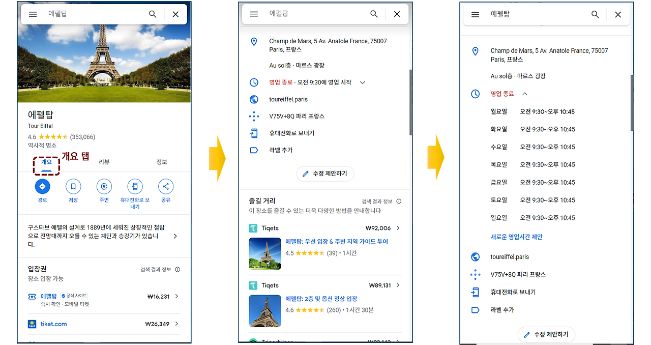 <개요> 탭에서 보여지는 항목들을 살펴보면 해당 장소에 관한 간략한 소개, 입장권 구매처, 주소, 영업시간, 홈페이지, 즐길거리, 해당 건물 입점 매장, 질문과 답변, 리뷰, 사진, 인터넷 상의 정보 등 다양한 항목을 보여준다. 영업시간을 클릭하면 요일별 영업시간을 보여준다. 유적지나 박물관 등을 방문할 계획이라면 반드시 휴무일을 사전에 확인해야 하며, 티켓도 현장에서 구매하기 보다 온라인으로 사전 구매할 필요가 있다.