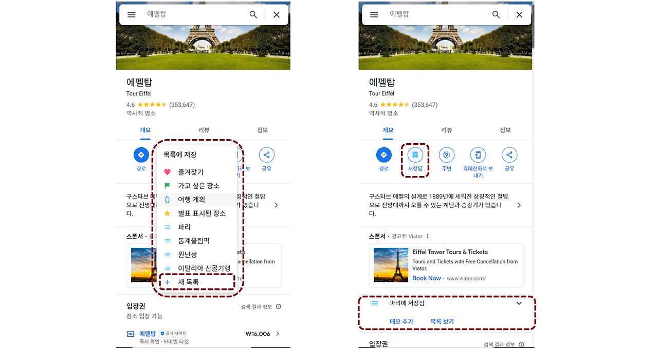 다음의 그림 2와 그림 3의 첫 번째 화면에서 <개요> 탭 하단에는 경로, 저장, 주변, 휴대전화로 보내기, 공유의 하위 기능들이 나열되어 있다. 이들 기능 중 저장은 탐색 중인 장소를 즐겨찾기로 저장하는 기능으로 저장된 장소들은 [저장됨] 메뉴에서 관리할 수 있다. 저장 아이콘을 클릭한 후 해당 장소를 저장하고 싶은 목록을 선택하면 선택한 목록에 저장된다. 구글지도에서는 즐겨찾기, 가고 싶은 장소, 여행 계획, 별표 표시된 장소 의 기본 목록을 제공하며 이 목록들은 사용자가 임의 삭제할 수 없다. 새로운 목록을 추가하고 싶은 경우에는 하단의 새 목록을 선택하여 목록명을 입력하여 생성 후 해당 목록에 저장하면 된다. 목록에 저장된 장소일 경우 저장됨 아이콘의 내부가 채워져 있으며 해당 장소가 어떤 목록에 저장되었는지를 보여준다. 저장된 장소를 목록에서 제외하고자 할 경우에는 저장됨 아이콘을 클릭한 후 나타난 목록에서 체크 표시를 지우면 된다.
